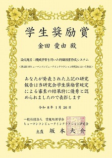 2026.01 - M2の清水君が 複数の360度カメラによる複数人物追跡とユーザが選択可能な視点提供システム を,金田さんが 機械学習を用いた刺繍図案作成システム を1月14~15日に宮古島で開催された情報処理学会 第216回ヒューマンコンピュータインタラクション研究会 で発表し,金田さんの発表が 学生奨励賞 を獲得しました.